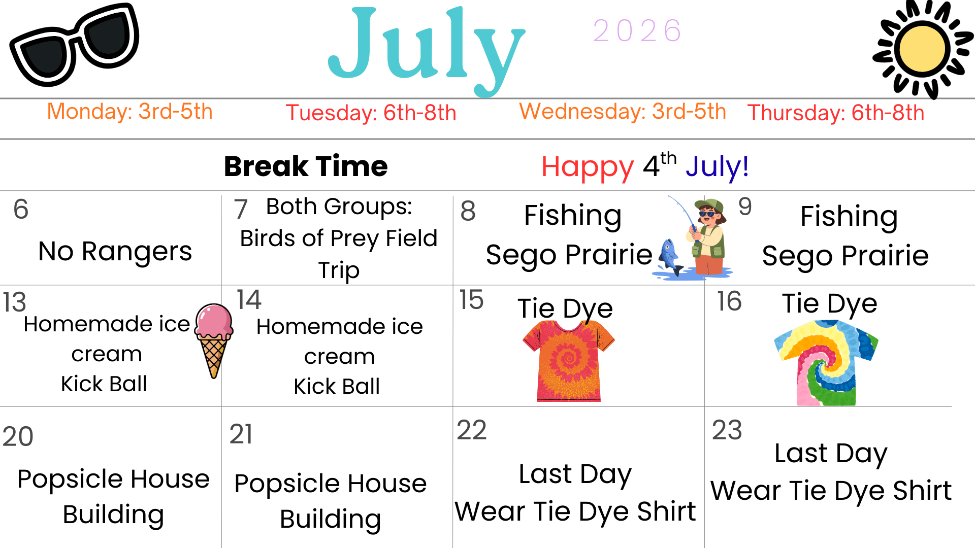 - 6th-8th Graders - Thursday July 23rd: LAST DAY (Wear Tie Dye Shirt)