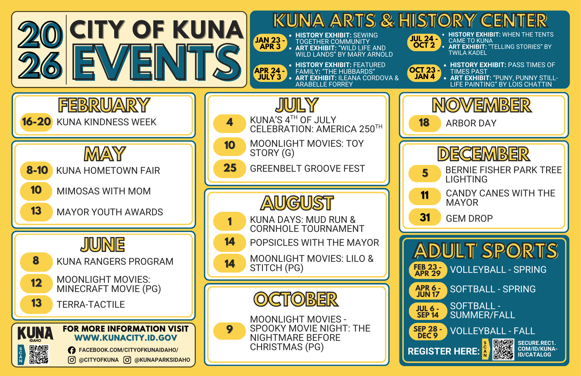 Announcing the City of Kuna’s 2026 calendar of special events! Mark your calendars for your favorites, from Hometown Fair to Moonlight Movies, and beyond! Be sure to follow this page for additional events, and some new surprises, throughout the year!